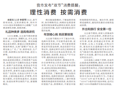 元旦、春节即将来临,又到消费旺季,郑州市12315投诉举报维权中心提醒广大消费者理性消费,按需消费。(今日《郑州日报》3版)