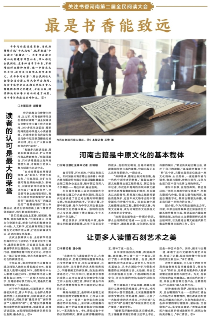 书香河南建设是省委、省政府持续实施“十大战略”、统筹推进“十大建设”举措之一。书香河南建设对加快构建学习型社会,深入推进全民阅读,完善终身学习体系,不断增强群众精神力量,进一步坚定文化自信、提升文化自觉具有重要意义。在书香河南第二届全民阅读大会暨全省古籍工作大会举办期间,与会专家学者以及相关单位负责人围绕图书馆文化建设、古籍出版、阅读阵地创新等方面积极建言纳策,为书香河南建设添砖加瓦。(今日《河南日报》2版)