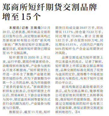 12月28日,记者获悉,郑州商品交易所近日发布公告,决定增加新凤鸣江苏新拓新材有限公司的“新凤鸣(新拓)”牌为指定短纤交割品牌。截至目前,郑商所短纤期货已增设至15个交割品牌。(今日《河南日报》2版)