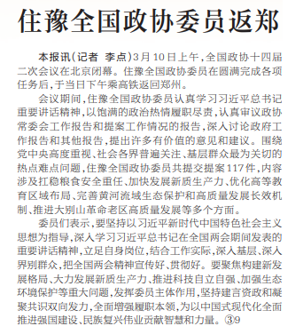 3月10日上午,全国政协十四届二次会议在北京闭幕。住豫全国政协委员在圆满完成各项任务后,于当日下午乘高铁返回郑州。(今日《河南日报》2版)
