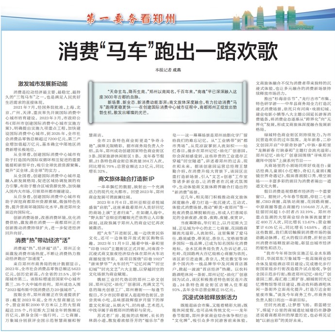 新场景、新业态、新消费动能澎湃;商文旅体深度融合,有力拉动消费“马车”跑得更稳更快……在创建国际消费中心城市征程中,商都郑州正绽放出勃勃生机,散发出璀璨的光芒。(今日《郑州日报》2版)