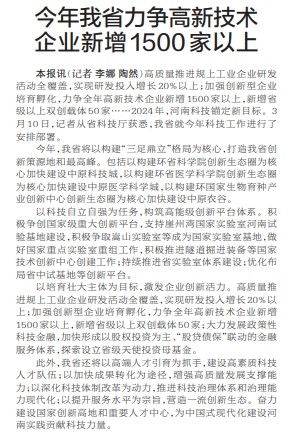 高质量推进规上工业企业研发活动全覆盖,实现研发投入增长20%以上;加强创新型企业培育孵化,力争全年高新技术企业新增1500家以上,新增省级以上双创载体50家……2024年,河南科技锚定新目标。3月10日,记者从省科技厅获悉,我省就今年科技工作进行了安排部署。(今日《郑州日报》2版)