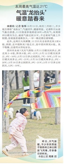 3月11日,农历二月初二,不少地方喜称“龙抬头”,气温回升,暖意明显。记者昨日从省气象台获悉,11日我省多地将迎20℃+的天气,本周郑州以晴天为主,最高气温达到21℃,不过夜间气温上升较缓,昼夜温差逐渐加大,一早一晚还需注意保暖。(今日《郑州日报》2版)