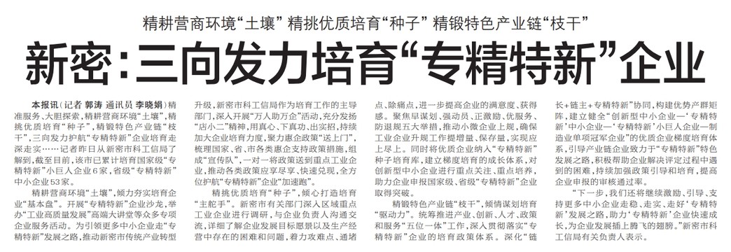 精准服务、大胆探索,精耕营商环境“土壤”,精挑优质培育“种子”,精锻特色产业链“枝干”,三向发力护航“专精特新”企业培育走深走实……记者昨日从新密市科工信局了解到,截至目前,该市已累计培育国家级“专精特新”小巨人企业6家,省级“专精特新”中小企业53家。(今日《郑州日报》7版)