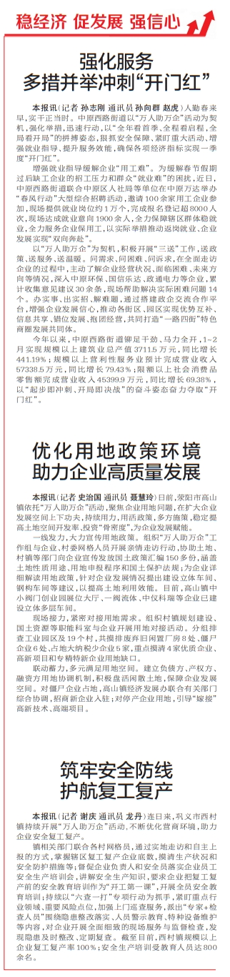 人勤春来早,实干正当时。中原西路街道以“万人助万企”活动为契机,强化举措,迅速行动,以“全年看首季、全程看启程,全局看开局”的拼搏姿态,狠抓安全保障、紧盯重大活动、增强就业指导、提升服务效能,确保各项经济指标实现一季度“开门红”。(今日《郑州日报》7版)