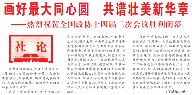 凝聚共识筑同心,广谋良策创伟业。3月10日,全国政协十四届二次会议不负重托、不辱使命,圆满完成各项议程,在北京胜利闭幕。我们对大会的成功表示热烈祝贺!(今日《人民日报》1版、2版)