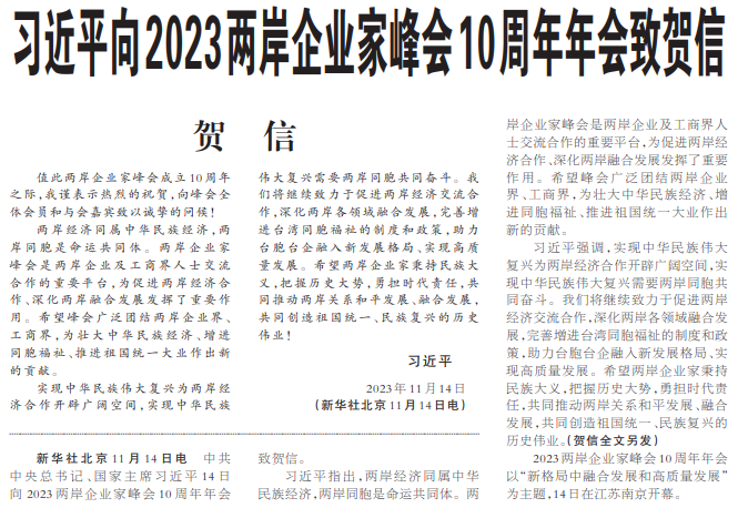 中共中央总书记、国家主席习近平14日向2023两岸企业家峰会10周年年会致贺信。(今日《人民日报》1版)