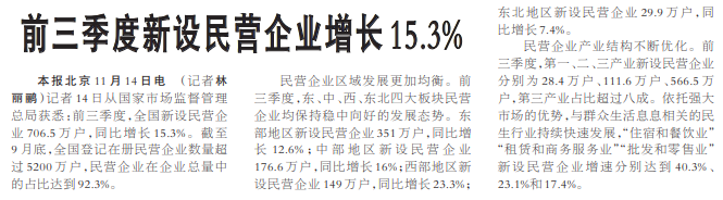前三季度新设民营企业增长15.3%