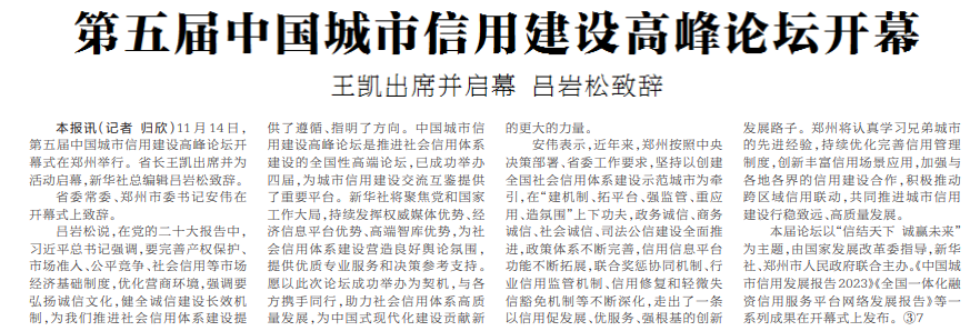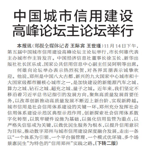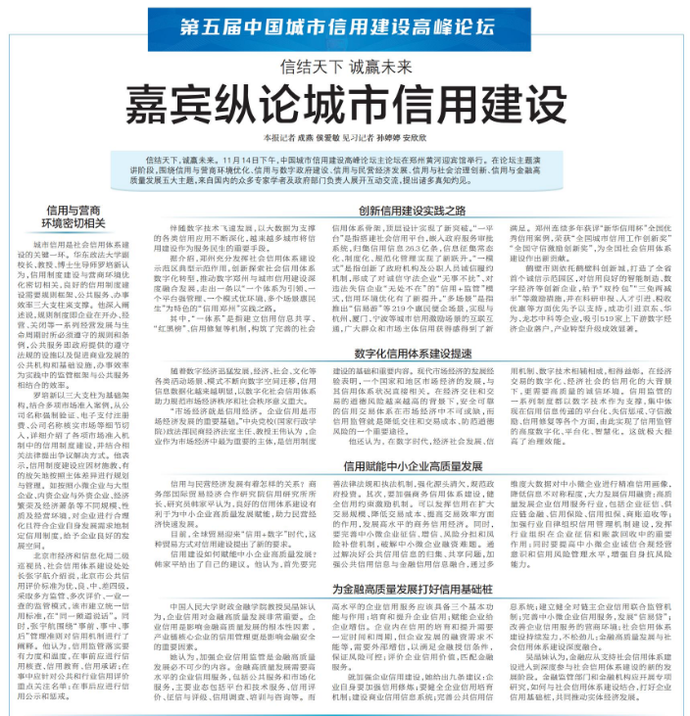 信结天下,诚赢未来。11月14日下午,中国城市信用建设高峰论坛主论坛在郑州黄河迎宾馆举行。在论坛主题演讲阶段,围绕信用与营商环境优化、信用与数字政府建设、信用与民营经济发展、信用与社会治理创新、信用与金融高质量发展五大主题,来自国内的众多专家学者及政府部门负责人展开互动交流,提出诸多真知灼见。(今日《郑州日报》6版)