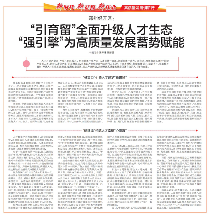 人才兴则产业兴,产业兴则区域兴。科技是第一生产力,人才是第一资源,创新是第一动力。近年来,郑州经开区坚持“围绕产业抓人才、抓好人才促产业”的发展思路,突出以产业企业为代表的用人主体引才育才地位,创新政策引才、培训育才、生态留才机制,开辟人才引进多元渠道,赋能企业发展,助力产业升级,为经开区高质量发展提供强有力的人才智力支撑。(今日《郑州日报》2版)
