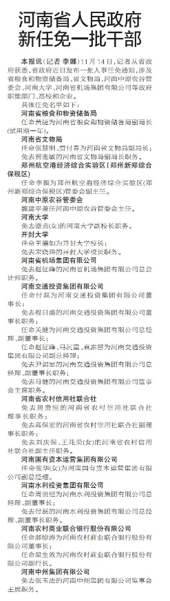 11月14日,记者从省政府获悉,省政府近日发布一批人事任免通知,涉及省粮食和物资储备局、省文物局、河南中原农谷管委会、河南大学、河南省机场集团有限公司等政府职能部门、高校和企业。(今日《郑州日报》2版)