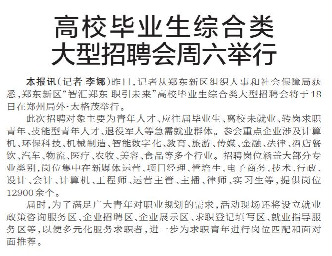 昨日,记者从郑东新区组织人事和社会保障局获悉,郑东新区“智汇郑东 职引未来”高校毕业生综合类大型招聘会将于18日在郑州局外·太格茂举行。(今日《郑州日报》5版)