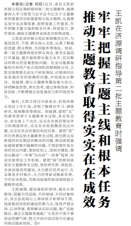 近日,省长王凯到济源示范区调研指导第二批主题教育,强调要深入学习贯彻习近平总书记关于主题教育的重要讲话和重要指示批示精神,认真落实党中央决策部署,按照省委工作要求,牢牢把握主题主线和根本任务,持续发力、善作善成,确保主题教育走深走实取得成效。(今日《河南日报》1版)