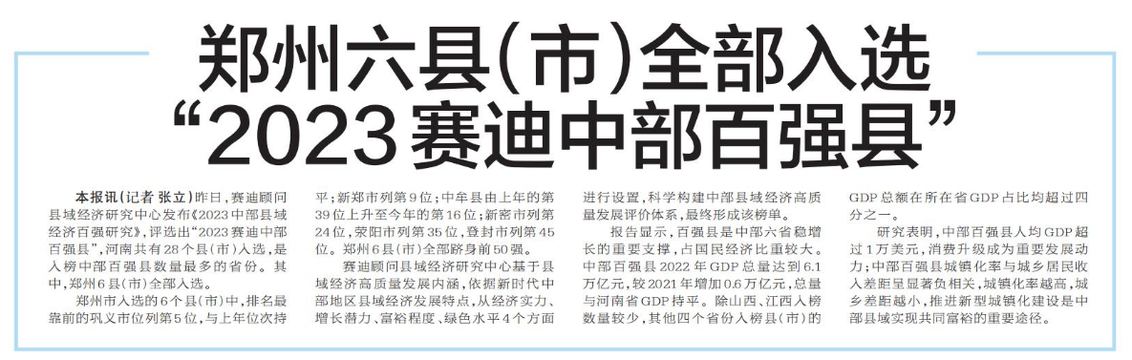 郑州六县(市)全部入选 “2023赛迪中部百强县”
