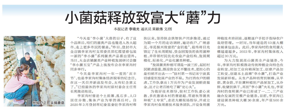 “今天是‘李小菌’大喜的日子,有了这个品牌后,咱们的菌类产品也能进入各大超市,走上更多市民的餐桌。”昨日,登封市大金店镇李家沟村支部委员郑红霞望着包装一新的“李小菌”系列菌类产品喜出望外。当日,大金店镇菌类产业种植发展研讨会暨“李小菌五宝”产品上线发布会在李家沟村同步举行。(今日《郑州日报》7版)