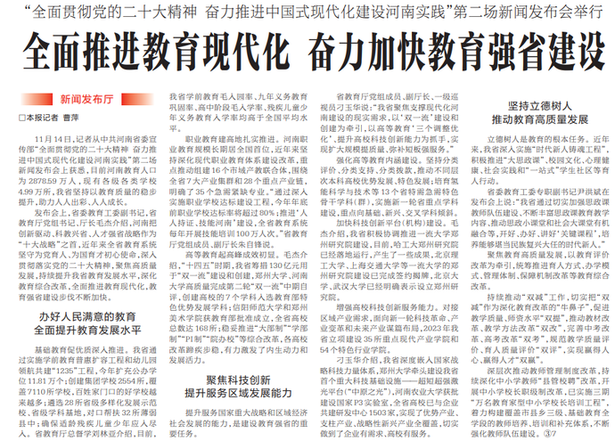 昨日,“全面贯彻党的二十大精神 奋力推进中国式现代化建设河南实践”教育专场新闻发布会在郑州召开,介绍全省教育部门在全面贯彻落实党的二十大精神方面的进展情况和成果成效。(今日《郑州日报》1版、2版)