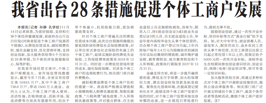 11月14日记者获悉,为更好鼓励、支持和引导个体经济健康发展,省政府办公厅近日印发《河南省促进个体工商户发展若干措施》,从降低经营成本、减轻税费负担、强化金融支持、优化营商环境、支持创业创新、加大服务供给等6个方面出台28条举措,为个体经济发展提振信心、保驾护航。(今日《河南日报》3版)