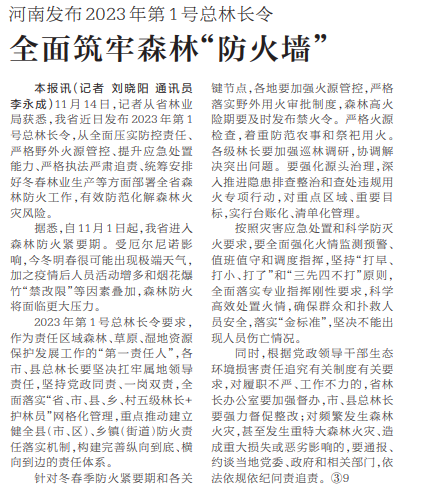 11月14日,记者从省林业局获悉,我省近日发布2023年第1号总林长令,从全面压实防控责任、严格野外火源管控、提升应急处置能力、严格执法严肃追责、统筹安排好冬春林业生产等方面部署全省森林防火工作,有效防范化解森林火灾风险。(今日《河南日报》3版)