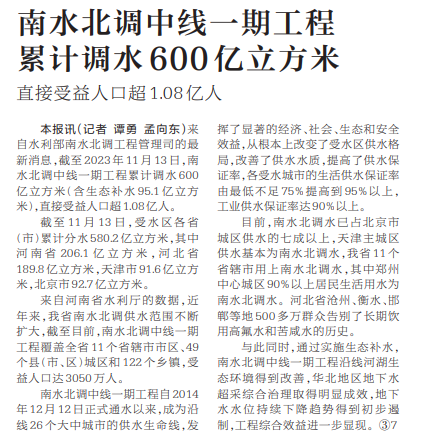 来自水利部南水北调工程管理司的最新消息,截至2023年11月13日,南水北调中线一期工程累计调水600亿立方米(含生态补水95.1亿立方米),直接受益人口超1.08亿人。(今日《河南日报》3版)