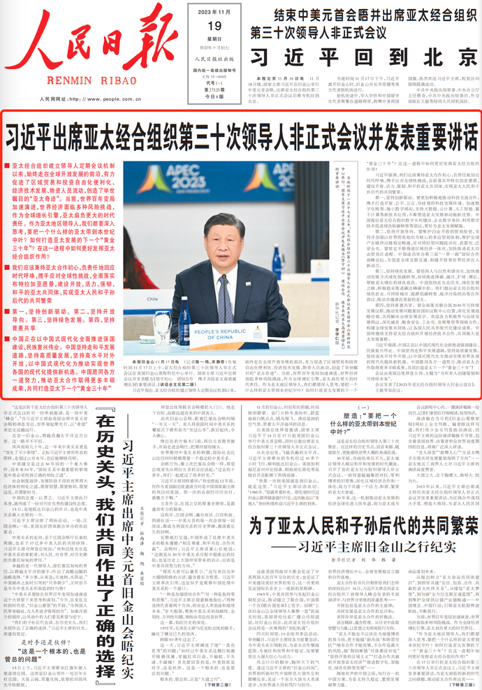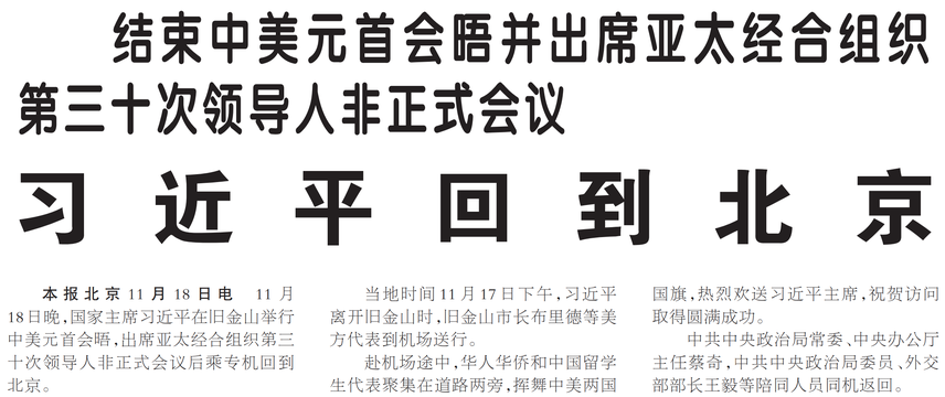 11月18日晚,国家主席习近平在旧金山举行中美元首会晤,出席亚太经合组织第三十次领导人非正式会议后乘专机回到北京。(今日《人民日报》1版)