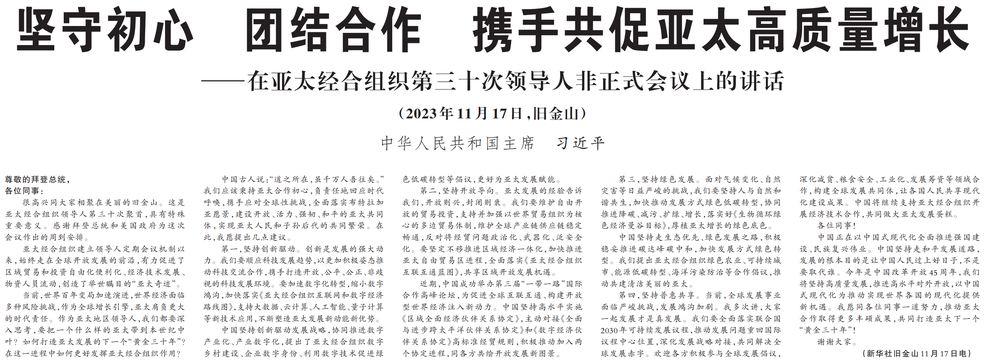 当地时间11月17日上午,亚太经合组织第三十次领导人非正式会议在美国旧金山莫斯科尼中心举行。国家主席习近平出席会议并发表题为《坚守初心团结合作携手共促亚太高质量增长》的重要讲话。(今日《人民日报》1版)