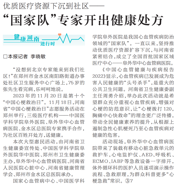 2023年的11月20日是第十个“中国心梗救治日”。11月18日,河南省“中国心梗救治日”志愿服务活动在郑州举行,三级医疗机构——中国医学科学院阜外医院、阜外华中心血管病医院、金水区总医院专家携手合作,为社区百姓开处方,送健康。(今日《河南日报》4版)