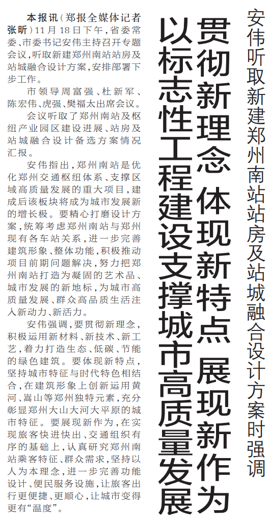 11月18日下午,省委常委、市委书记安伟主持召开专题会议,听取新建郑州南站站房及站城融合设计方案,安排部署下步工作。(今日《郑州日报》1版)