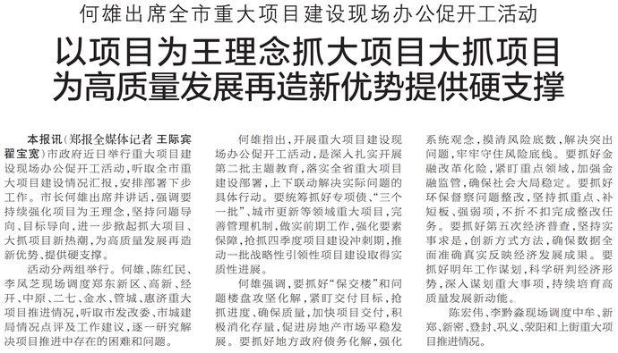 市政府近日举行重大项目建设现场办公促开工活动,听取全市重大项目建设情况汇报,安排部署下步工作。市长何雄出席并讲话,强调要持续强化项目为王理念,坚持问题导向、目标导向,进一步掀起抓大项目、大抓项目新热潮,为高质量发展再造新优势、提供硬支撑。(今日《郑州日报》1版)