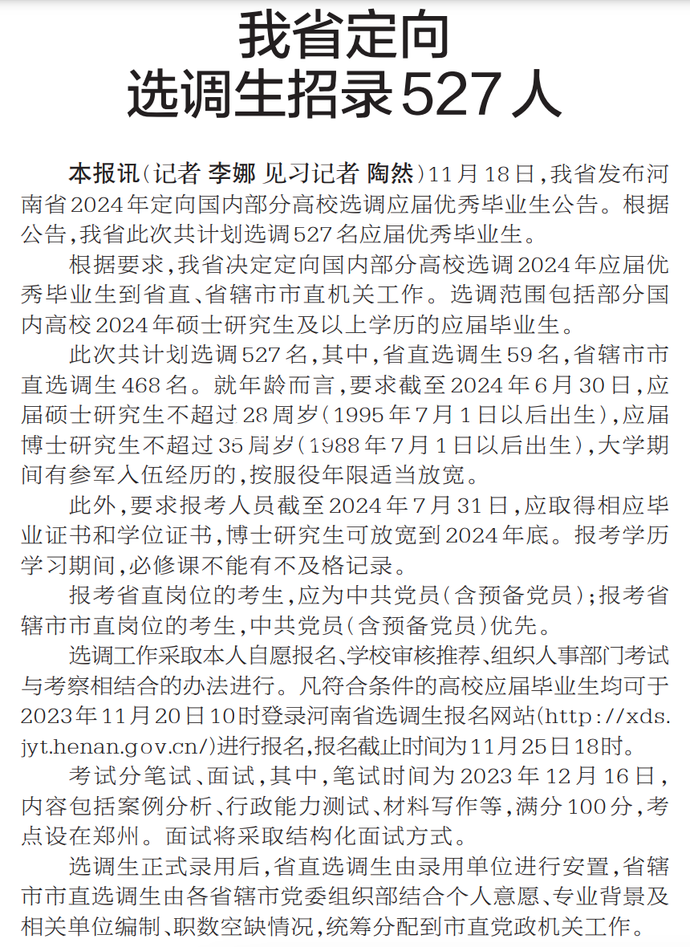 11月18日,我省发布河南省2024年定向国内部分高校选调应届优秀毕业生公告。根据公告,我省此次共计划选调527名应届优秀毕业生。(今日《郑州日报》4版)