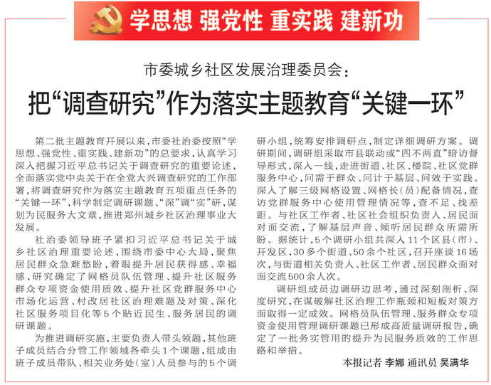 第二批主题教育开展以来,市委社治委按照“学思想、强党性、重实践、建新功”的总要求,认真学习深入把握习近平总书记关于调查研究的重要论述,全面落实党中央关于在全党大兴调查研究的工作部署,将调查研究作为落实主题教育五项重点任务的“关键一环”,科学制定调研课题、“深”调“实”研,谋划为民服务大文章,推进郑州城乡社区治理事业大发展。(今日《郑州日报》4版)