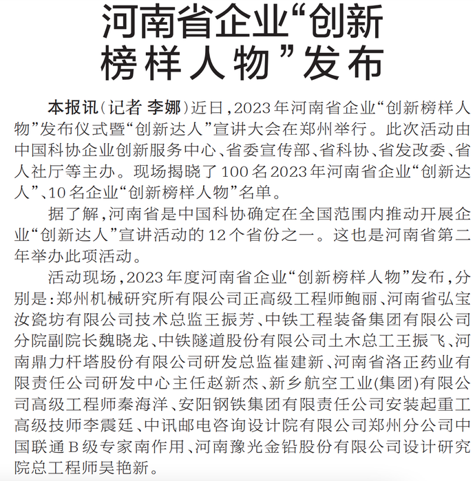 近日,2023年河南省企业“创新榜样人物”发布仪式暨“创新达人”宣讲大会在郑州举行。此次活动由中国科协企业创新服务中心、省委宣传部、省科协、省发改委、省人社厅等主办。现场揭晓了100名2023年河南省企业“创新达人”、10名企业“创新榜样人物”名单。(今日《郑州日报》4版)