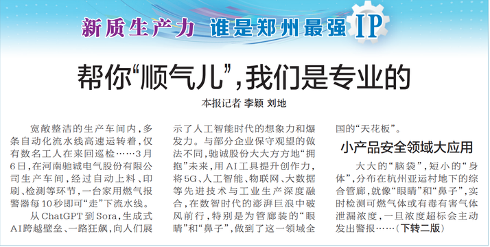宽敞整洁的生产车间内,多条自动化流水线高速运转着,仅有数名工人在来回巡检……3月6日,在河南驰诚电气股份有限公司生产车间,经过自动上料、印刷、检测等环节,一台家用燃气报警器每10秒即可“走”下流水线。(今日《郑州日报》1版、2版)