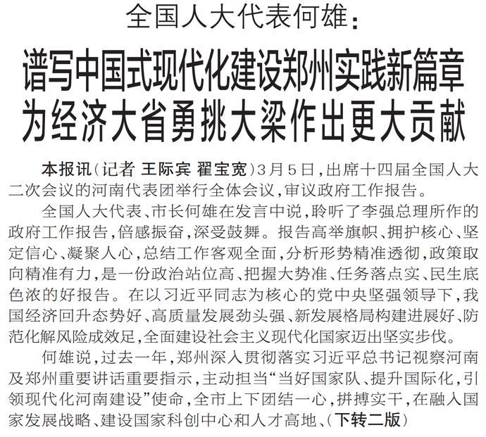 3月5日,出席十四届全国人大二次会议的河南代表团举行全体会议,审议政府工作报告。(今日《郑州日报》1版、2版)