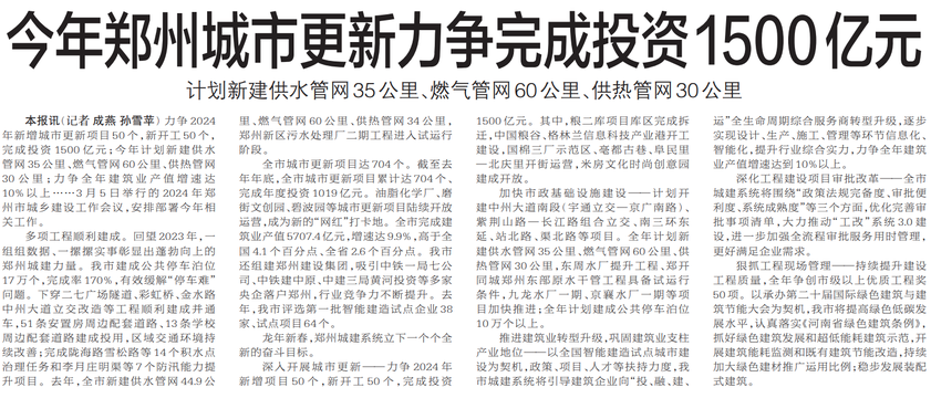 力争2024年新增城市更新项目50个,新开工50个,完成投资1500亿元;今年计划新建供水管网35公里、燃气管网60公里、供热管网30公里;力争全年建筑业产值增速达10%以上……3月5日举行的2024年郑州市城乡建设工作会议,安排部署今年相关工作。(今日《郑州日报》7版)