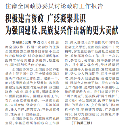 3月6日,出席全国政协十四届二次会议的住豫全国政协委员参加各自界别小组会议或联组会议,讨论李强总理所作的政府工作报告和计划报告、预算报告、国务院组织法修订草案。(今日《河南日报》1版、3版)