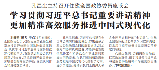 3月6日晚,全国政协委员、省政协主席孔昌生在京主持召开住豫全国政协委员座谈会,认真学习习近平总书记在参加江苏代表团审议,看望参加政协会议的民革、科技界、环境资源界委员并参加联组会时的重要讲话,交流认识体会和贯彻落实举措。(今日《河南日报》1版、3版)
