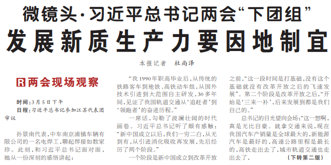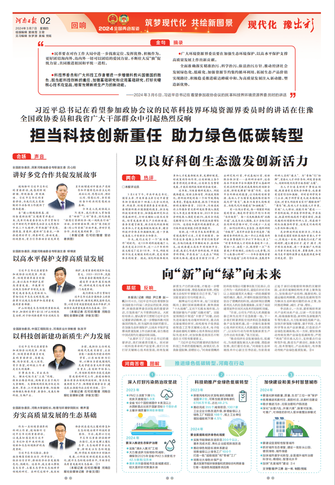 代表们表示,要深入学习贯彻习近平总书记重要讲话精神,牢牢把握高质量发展这个首要任务,抢抓新一轮科技革命和产业变革的历史性机遇,把发展新质生产力作为战略之举、长久之策,强化创新引领,注重数智赋能,加快绿色转型,推动传统产业提质升级、新兴产业培育壮大、未来产业抢滩占先,不断激发新动能、抢占新赛道、厚植新优势,推动中国式现代化建设河南实践迈出新步伐、取得新成效。(今日《河南日报》1版)
