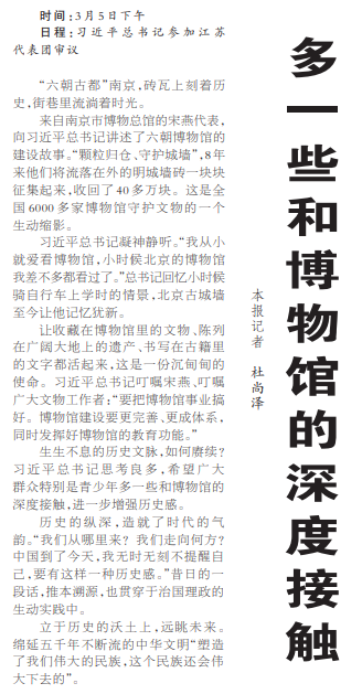 习近平总书记凝神静听。“我从小就爱看博物馆,小时候北京的博物馆我差不多都看过了。”总书记回忆小时候骑自行车上学时的情景,北京古城墙至今让他记忆犹新。(今日《人民日报》1版)