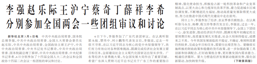 中共中央政治局常委、国务院总理李强,中共中央政治局常委、全国人大常委会委员长赵乐际,中共中央政治局常委、全国政协主席王沪宁,中共中央政治局常委、中央书记处书记蔡奇,中共中央政治局常委、国务院副总理丁薛祥,中共中央政治局常委、中央纪委书记李希,6日分别参加了十四届全国人大二次会议和全国政协十四届二次会议一些团组的审议和讨论。(今日《人民日报》1版、4版)