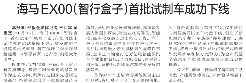11月15日,海马EX00(智行盒子)首批试制车成功下线,市长何雄出席仪式并启动车辆下线。省发改委二级巡视员杨献昌,省工信厅二级巡视员董建明,市领导黄卿、史占勇、樊福太等出席。(今日《郑州日报》1版)