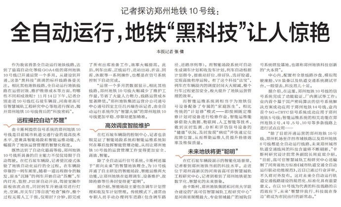 作为我省首条全自动运行地铁线路,达到了最高自动化等级GOA4级的郑州地铁10号线已开通运营一个多月。从建设到开通,这条“黑科技”满满的标杆线路备受关注。相比其他地铁线路,全自动运行地铁线路在运营时效、维护维修成本等方面,有哪些不同和成效呢?11月14日下午,记者分别走进10号线红石坡车辆段、河南省高可信智慧城轨工程研究中心等地进行探访,揭开郑州地铁10号线背后的“科技密码”。(今日《郑州日报》2版)