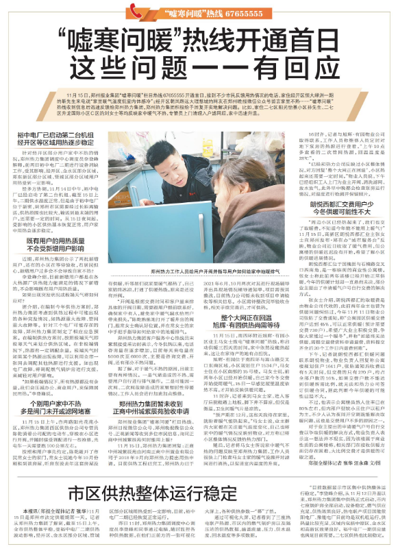 11月15日,郑州报业集团“嘘寒问暖”栏目热线67655555开通首日,接到不少市民反馈用热情况的电话,家住经开区恒大绿洲一期的靳先生来电说“家里暖气温度低室内体感冷”;经开区朝凤路远大理想城的网友在郑州晚报微信公众号留言家里不热……“嘘寒问暖”热线收到信息后迅速反馈给郑州热力集团,郑州热力集团积极给予回复并实地解决问题。比如,家住二七区阳光怡景小区孙先生、二七区升龙国际小区C区的刘女士等均反映家中暖气不热,专管员上门清理入户滤网后,家中迅速升温。(今日《郑州日报》5版)