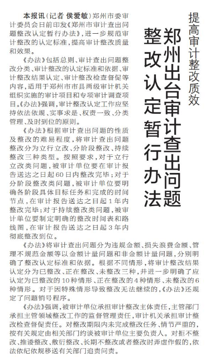 郑州市委审计委员会日前印发《郑州市审计查出问题整改认定暂行办法》,进一步规范审计整改的认定标准,提高审计整改质量和效果。(今日《郑州日报》5版)