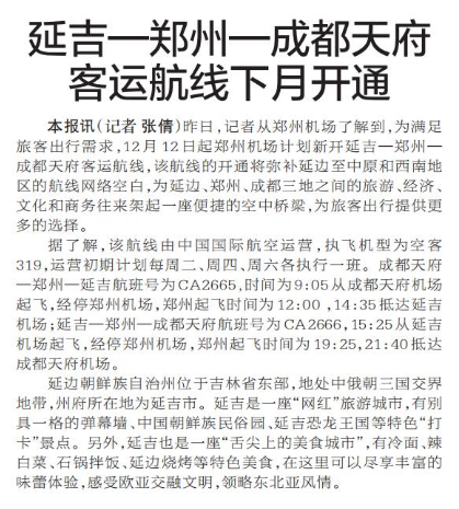 延吉—郑州—成都天府客运航线下月开通