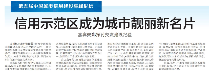 作为中国城市信用建设高峰论坛的主题论坛之一,社会信用体系建设示范区经验交流会昨日在郑举行。国家及相关省市社会信用体系建设负责人、专家学者相聚黄河之滨,共同交流探讨信用示范区实践探索。(今日《郑州日报》6版)