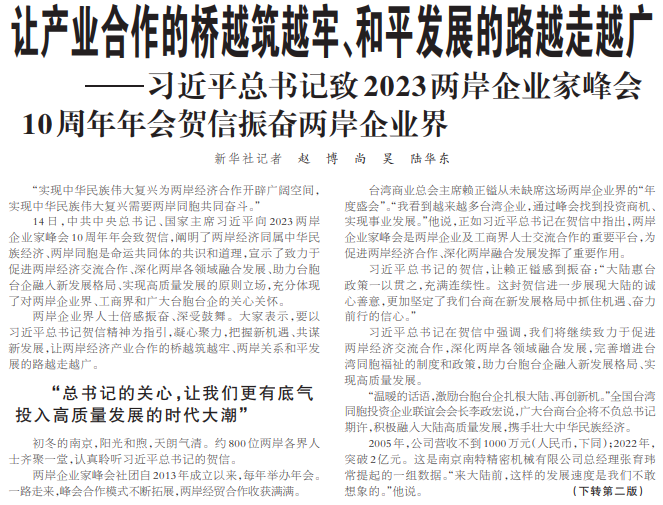 ——习近平总书记致2023两岸企业家峰会10周年年会贺信振奋两岸企业界