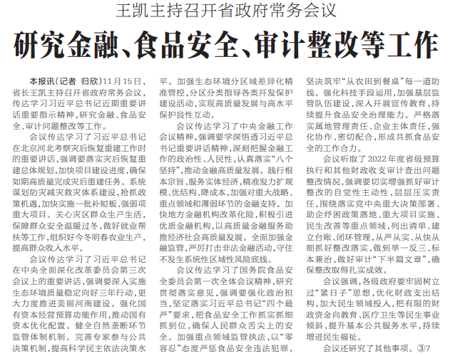 11月15日,省长王凯主持召开省政府常务会议,传达学习习近平总书记近期重要讲话重要指示精神,研究金融、食品安全、审计问题整改等工作。(今日《河南日报》1版)
