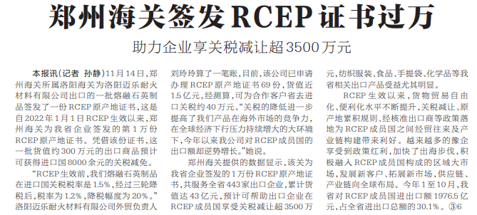 11月14日,郑州海关所属洛阳海关为洛阳迈乐耐火材料有限公司出口的一批熔融石英制品签发了一份RCEP原产地证书,这是自2022年1月1日RCEP生效以来,郑州海关为我省企业签发的第1万份RCEP原产地证书。凭借该份证书,这一批货值约300万元的出口商品预计可获得进口国8000余元的关税减免。(今日《河南日报》1版)