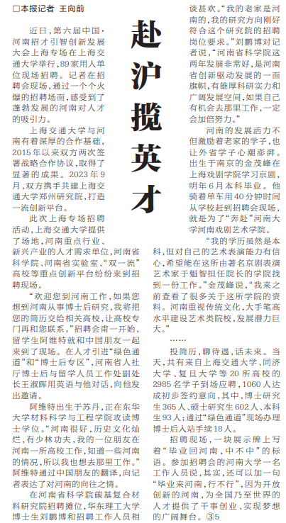 近日,第六届中国·河南招才引智创新发展大会上海专场在上海交通大学举行,89家用人单位现场招聘。记者在招聘会现场,通过一个个火爆的招聘场面,感受到了蓬勃发展的河南对人才的吸引力。(今日《河南日报》2版)