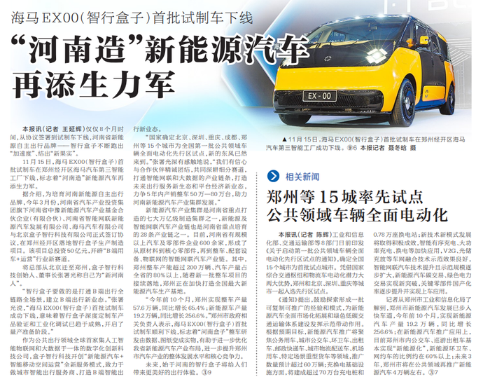 11月15日,海马EX00(智行盒子)首批试制车在郑州经开区海马汽车第三智能工厂下线,标志着“河南造”新能源汽车再添生力军。(今日《河南日报》3版)